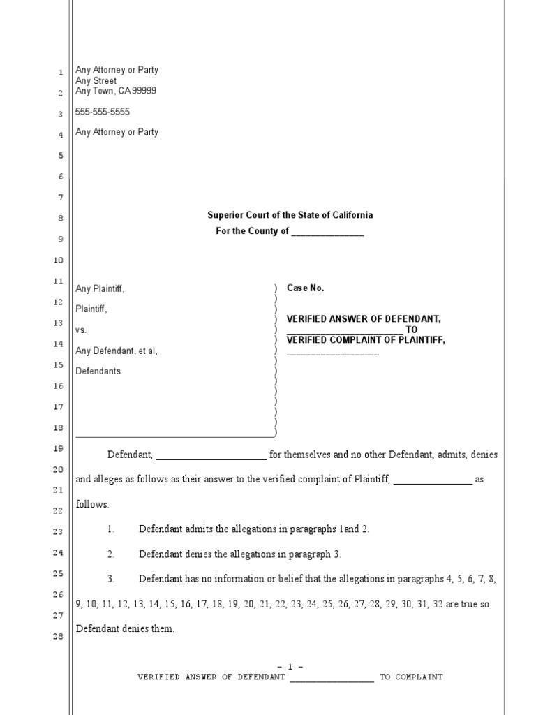 Sample Answer to Adverse Possession Complaint in California Complaint