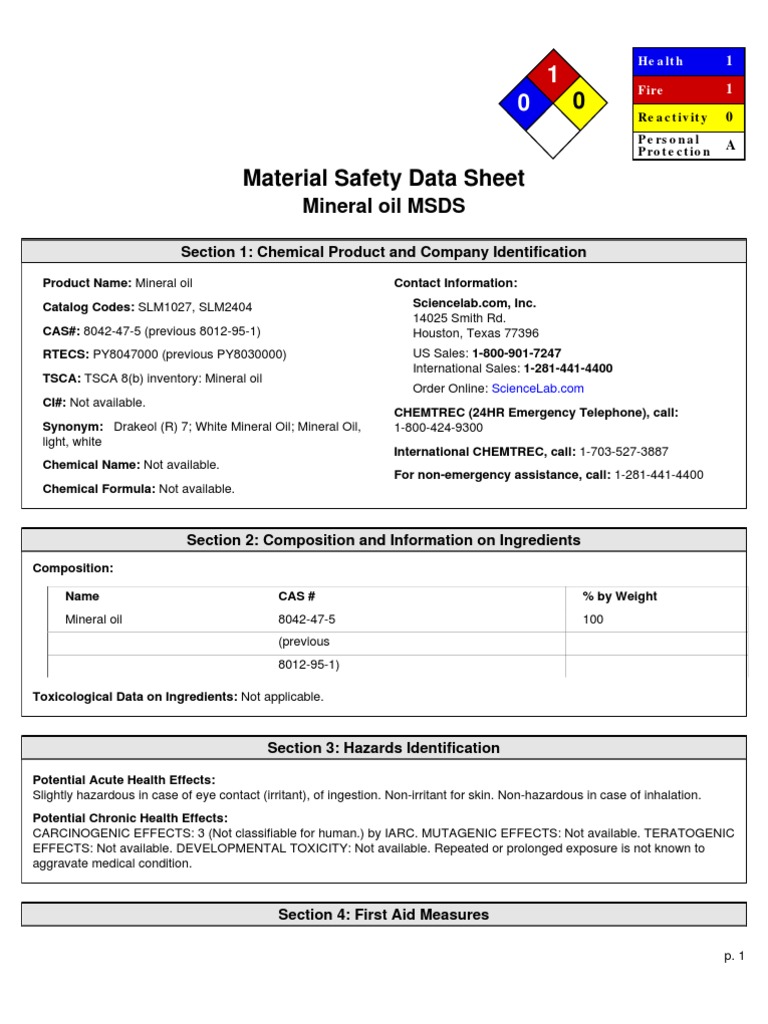 MSDS Mineral Oil Toxicity Flammability