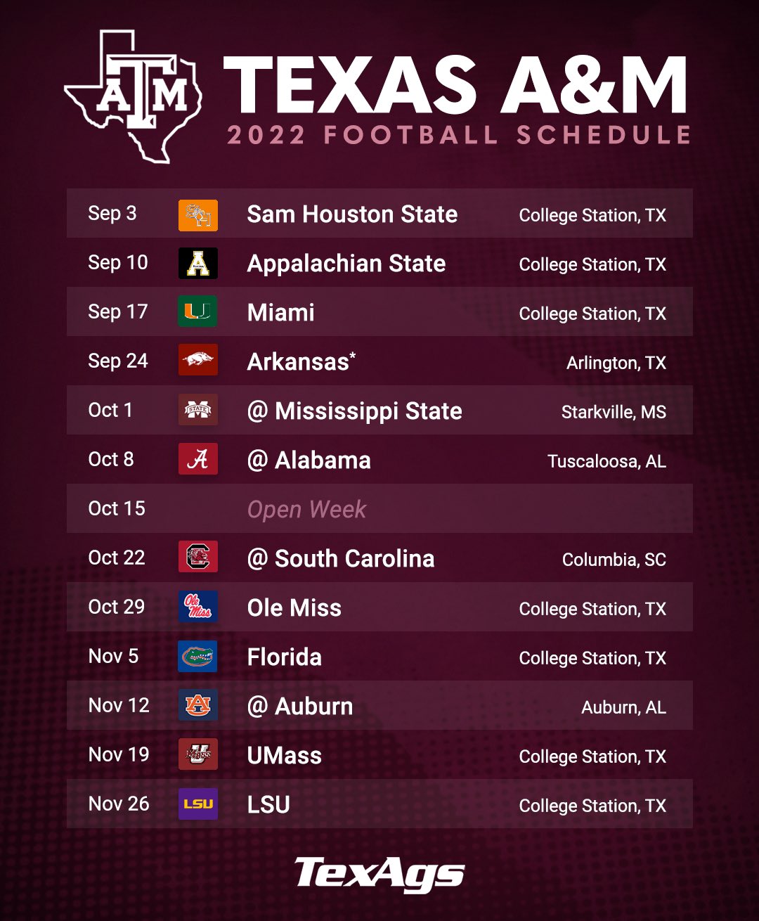 Espn (uk) has the full 2022 texas a&m aggies regular season ncaaf fixtures. Web view the 2022 texas a&m aggies schedule, results and scores for the 2022 fbs college football season. Web the official 2022 football schedule for the texas a&m aggies. Web the official 2020 football schedule for the texas a&m aggies. Web 2021 texas a&m aggies schedule and.